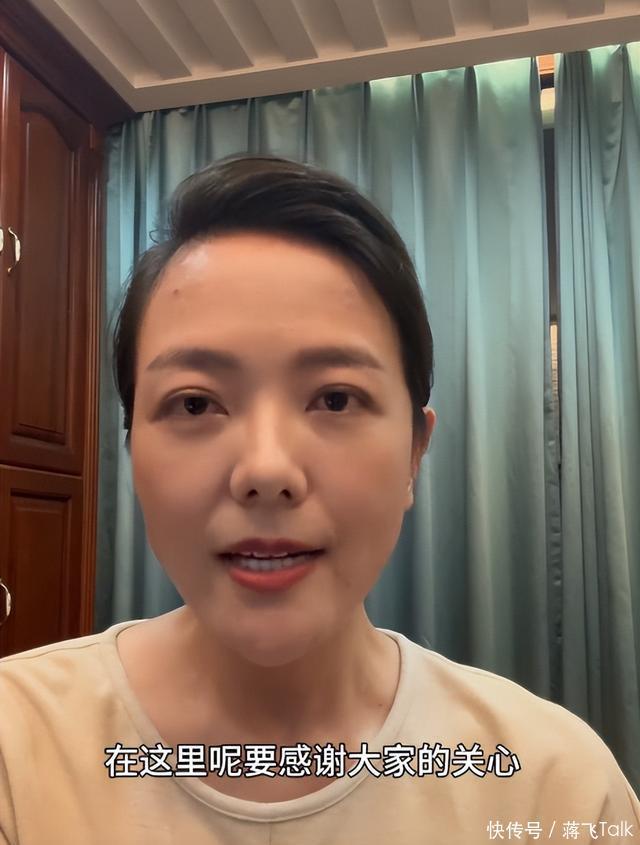 她穿着一件杏色的圆领上衣,头发全部扎在脑后,为了显得气色好,她画了个淡妆。 身上没有戴多余的饰品,整套穿搭很简约,她坐在镜头前,缓缓诉说着自己这段时间的经历。